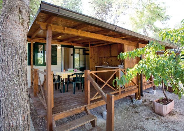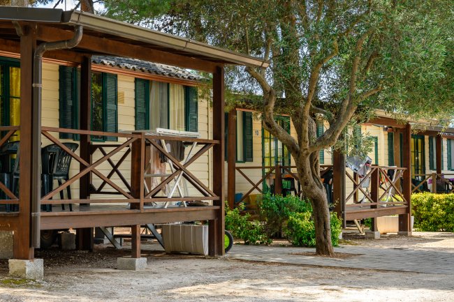 Alloggi in muratura con aria condizionata, composti da area giorno con angolo cottura, divano letto o letto a castello, bagno, 2 camere da letto con due posti ciascuna e veranda esterna. Alcune tipologie hanno la veranda esterna in comune con altri due appartamenti.