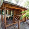 Veranda in legno con tavolo e sedie, di fronte a una casetta tra gli alberi.