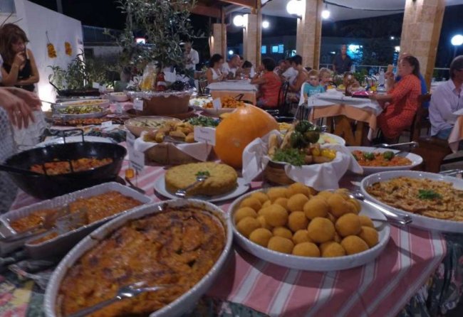 Tavolo buffet con vari piatti, tra cui arancini e verdure, persone sullo sfondo.