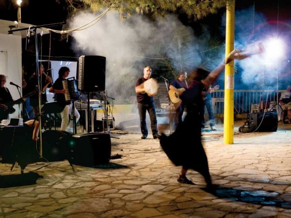Musicisti suonano all'aperto, una persona danza al centro della scena illuminata.