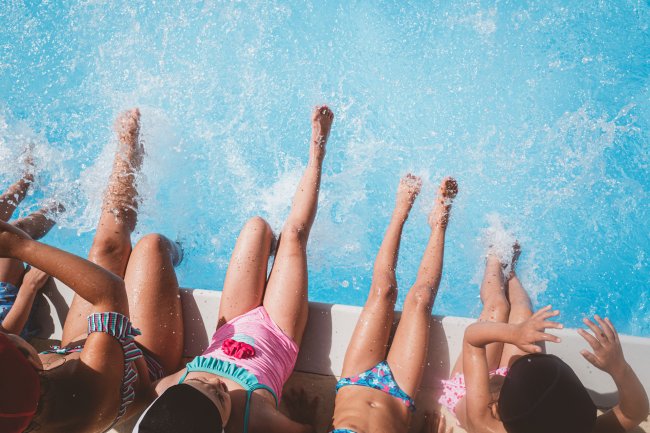 Tre persone sedute sul bordo di una piscina, con i piedi nell'acqua.